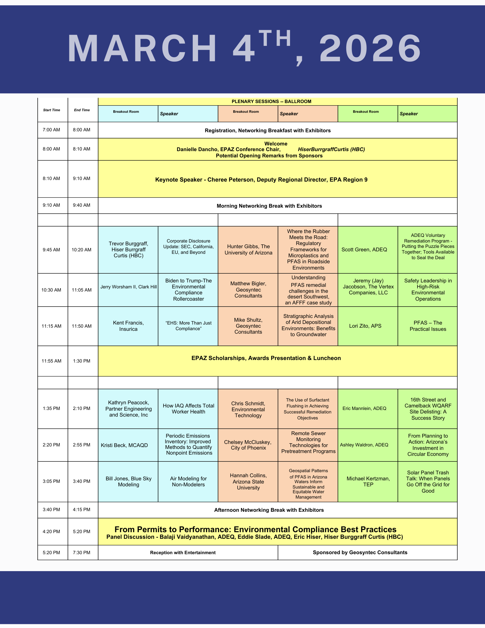 THE EPAZ CONFERENCE IS A GREAT OPPORTUNITY TO LEARN THE LATEST REGULATORY UPDATES RELATED TO AIR, SOIL, WATER AND WASTE AS WELL AS SHARE INDUSTRY SPECIFIC INFORMATION AND NETWORK AMONG YOUR PEERS. EXPECTED TOPICS ON OUR PROGRAM WILL INCLUDE REGULATORY & TECHNICAL UPDATES FOR INDUSTRY, MUNICIPALITIES AND MEDICAL FACILITIES AS IT RELATES TO AIR, WASTE & WATER, NEPA/ESA, EMERGENCY RESPONSE, EPCRA & OSHA/H&S AND MORE!